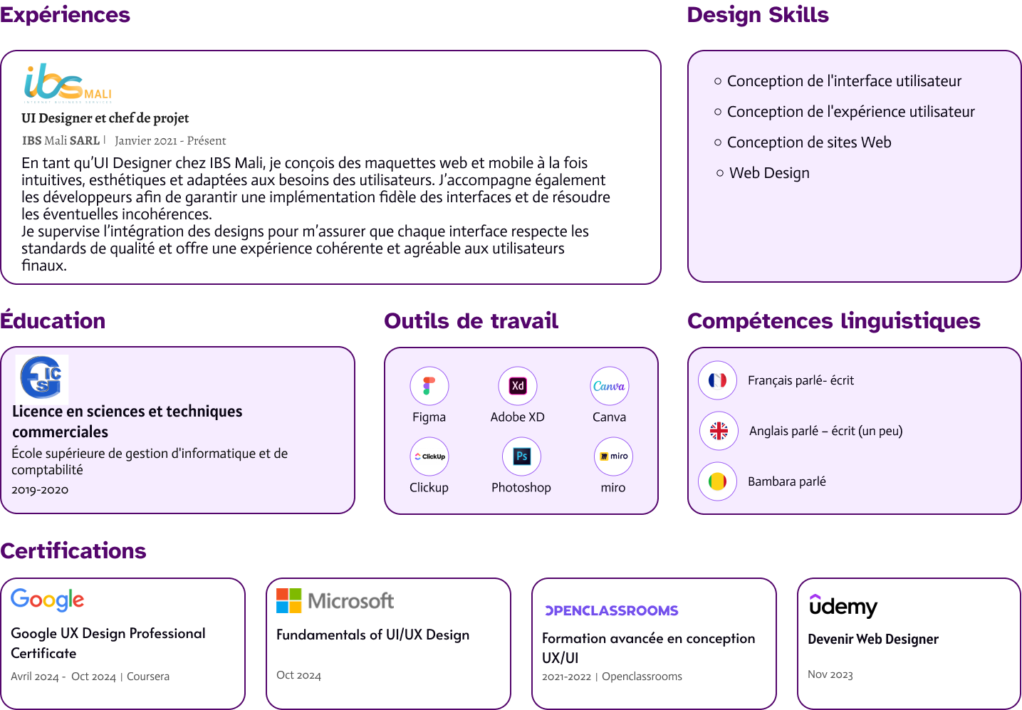 Je suis Fatoumata Bocoum, UI Designer orientée clarté, structure et co-création. J’accompagne les porteurs d’idées qui souhaitent transformer une vision floue en une expérience digitale cohérente, utilisable et simple à comprendre. Mon approche repose sur l’écoute, l’analyse et la transformation progressive : clarifier l’essentiel, organiser l’information, puis concevoir des interfaces avec intention.