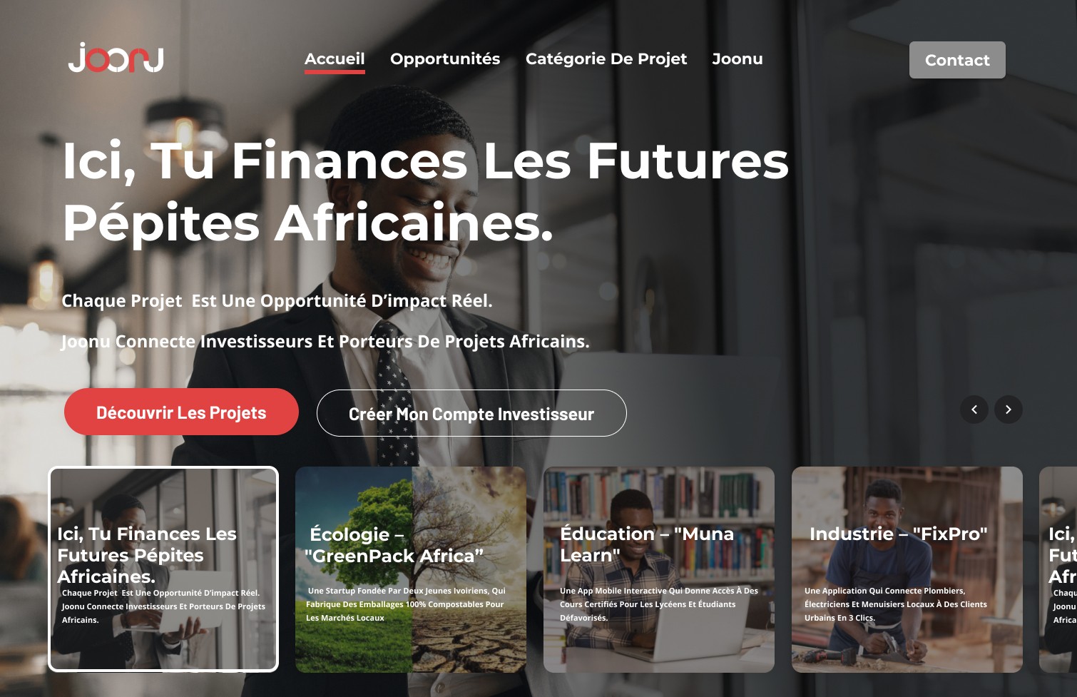 Joonu est une plateforme digitale orientée investissement et opportunités, pensée pour connecter des porteurs de projets et des investisseurs autour d’un espace clair, structuré et accessible.